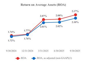 PPNRThe chart below highlights Home BancShares’ strong and consistent return on average assets (ROA) over the past five quarters. ROA, a key measure of how efficiently the Company utilizes its assets to generate net income, has demonstrated a steady upward trend, reaching 2.17% in Q3 2025. This improvement reflects the Company’s disciplined approach to asset management, prudent lending practices, and ongoing focus on operational efficiency.